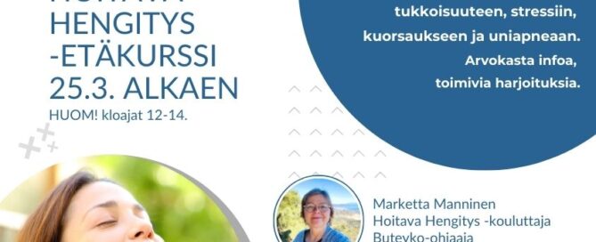 HENGITYS - hyödyntämätön terveydenlähde. Tervetuloa oppimaan lääkkeetöntä, luonnollista ja kokonaisvaltaista itsehoitomuotoa - Hoitavaa Hengitystä. Hoitava Hengitys HB ® perustuu tutkittuun, professori Konstantin [...]