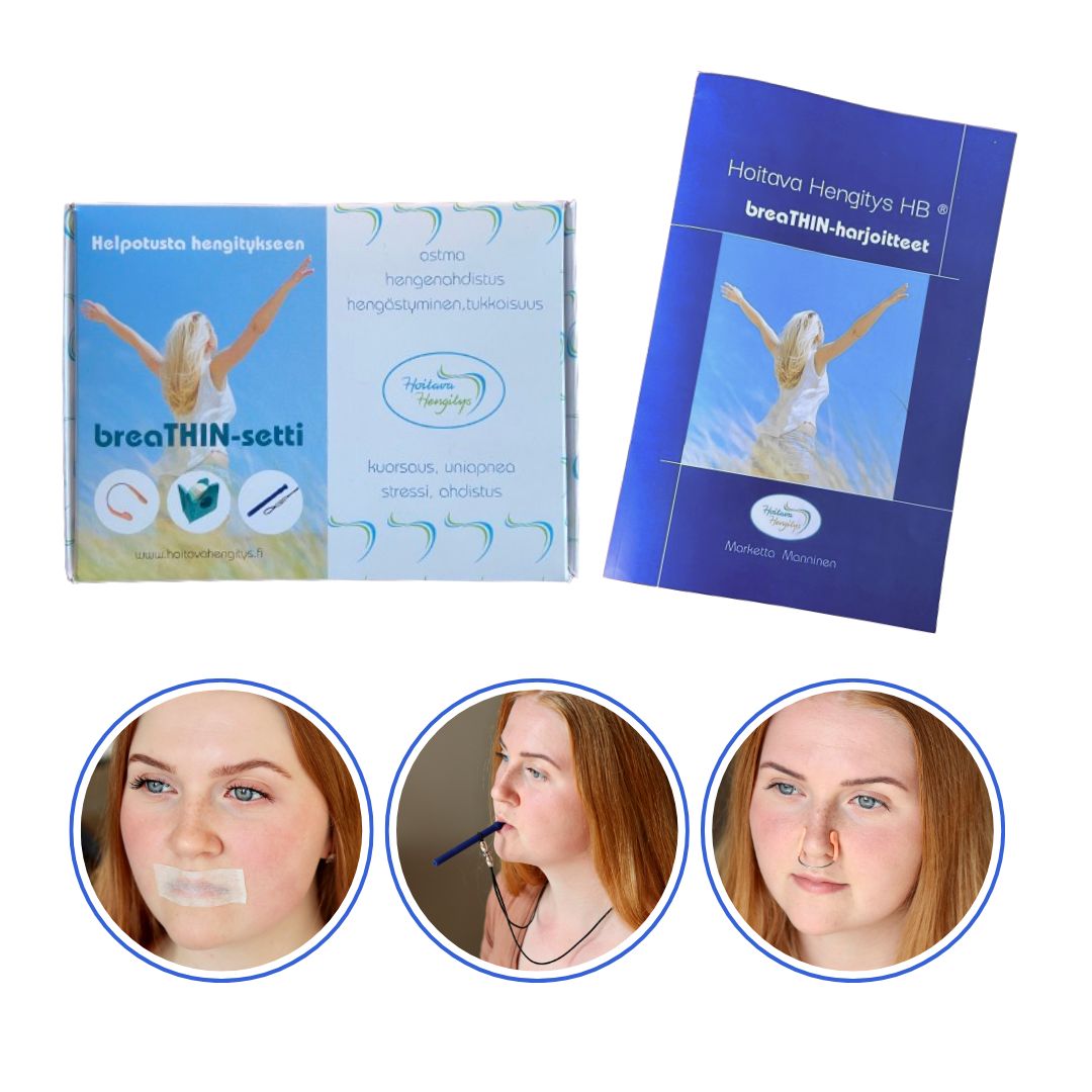 breaTHIN -setti sisältää kätevät apuvälineet, joiden avulla varmistat unenaikaisen nenähengityksen sekä vahvistat hengityslihaksia ja nielun sekä myös nenän lihaksia. Harjoitteiden avulla hengitystiet avautuvat, hiilidioksidin sietokyky kasvaa ja hengityskaasujen tasapaino sekä hapensaanti paranee. Mukana tulee kirjalliset ohjeet sisältävä ohjevihko (20 sivua).
