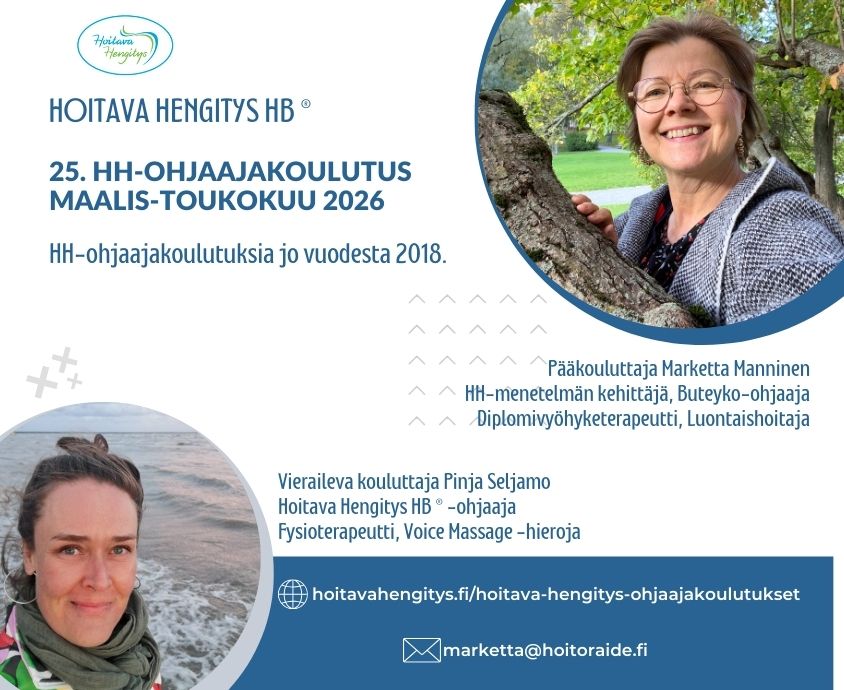 Pääkouluttajana toimii tuttuun tapaan Hoitava Hengitys HB ® -menetelmän kehittäjä ja Buteyko-ohjaaja Marketta Manninen.