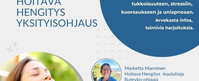 Tervetuloa Hoitava Hengitys -yksityisohjaukseen! Ohjauksesta saat sekä arvokasta teoriatietoa, että henkilökohtaista neuvontaa hengitysharjoitteluun. Tapaamisissa käydään läpi hengityksesi haasteet ja pohditaan haasteiden juurisyitä Buteyko-teorian näkökulmasta. [...]